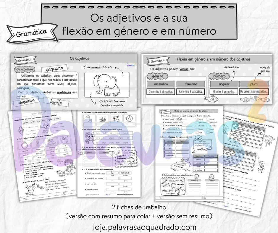 2 ficha de trabalho com mini resumo, para trabalhar os adjetivos e a sua flexão em género e em número.